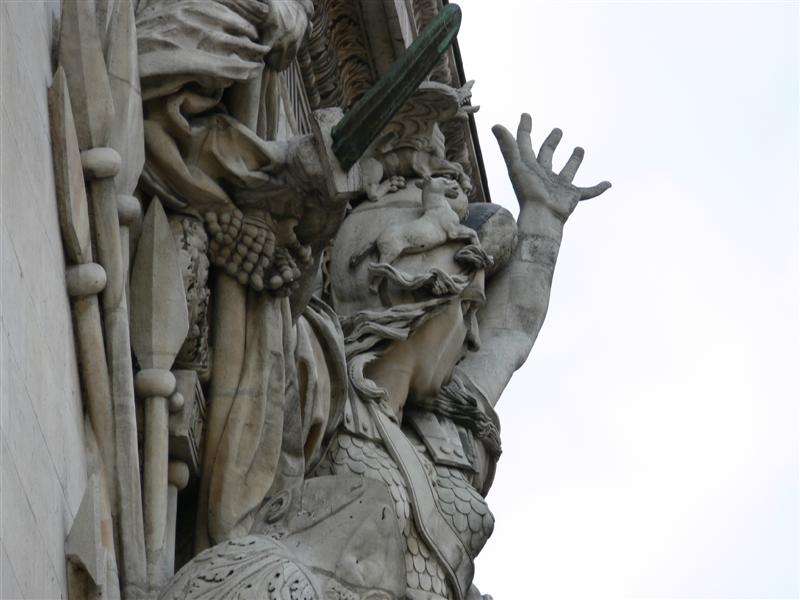 Ulkopuolella riemukaarta koristavat monet reliefit kuvastamassa aikaisempia taisteluita, joissa Napóleon oli mukana.
